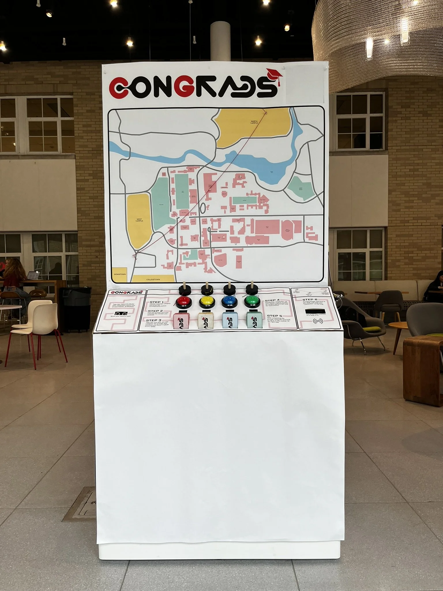 ConGrads is inspired by the themes of nostalgia and connection, expressed through a design modeled after a retro arcade machine. The use of bold primary colors, simple yet effective graphics, and a familiar silhouette creates an approachable and playful presence. The structure is constructed from laser-cut wood panels mounted on a rolling platform, with printed graphics reinforcing the visual identity. Each piece was carefully designed to conceal the electronics, resulting in a refined and intuitive appearance.