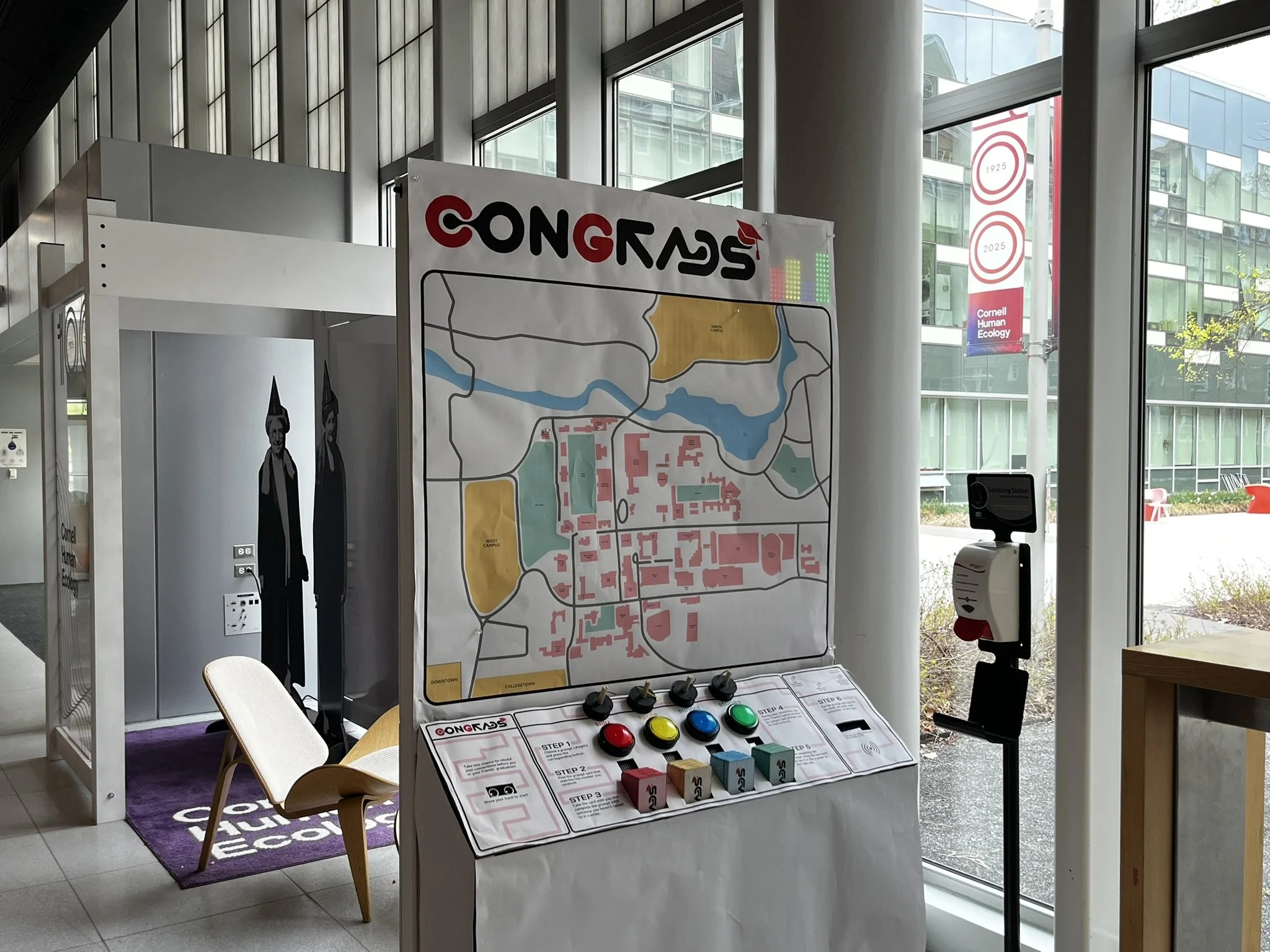 ConGrads is an interactive installation designed to help graduating students reflect on their Cornell journey by reconnecting with meaningful but often overlooked relationships. Through prompt cards, playful interactions, and a shared campus map, the station encourages students to reach out, reminisce, and celebrate the connections that shaped their time at Cornell. By blending collective memory with personal reflection, ConGrads transforms the moments before graduation into an opportunity for gratitude, closure, and community.