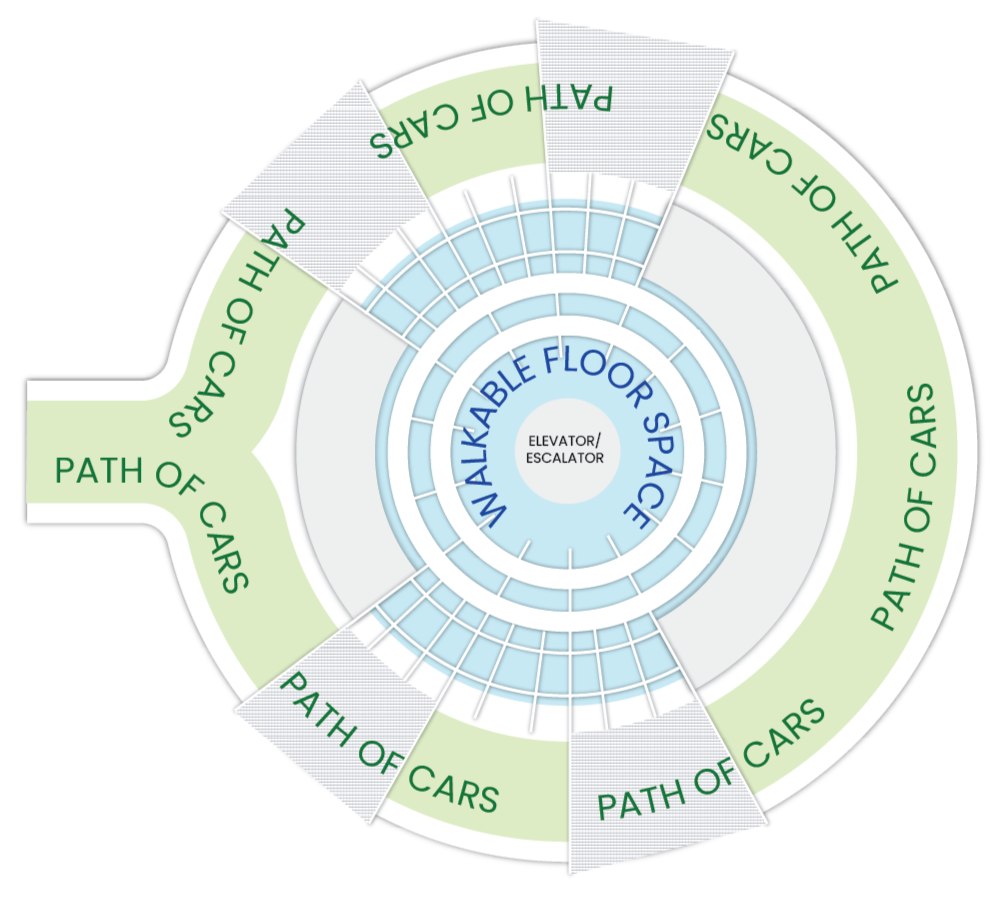 The circular layout enables both cars and pedestrians to move without conflict, avoiding the bottlenecks that often occur in linear or angular systems. This approach creates a more intuitive and adaptive spatial experience, streamlining traffic flow while reducing waiting times and confusion.