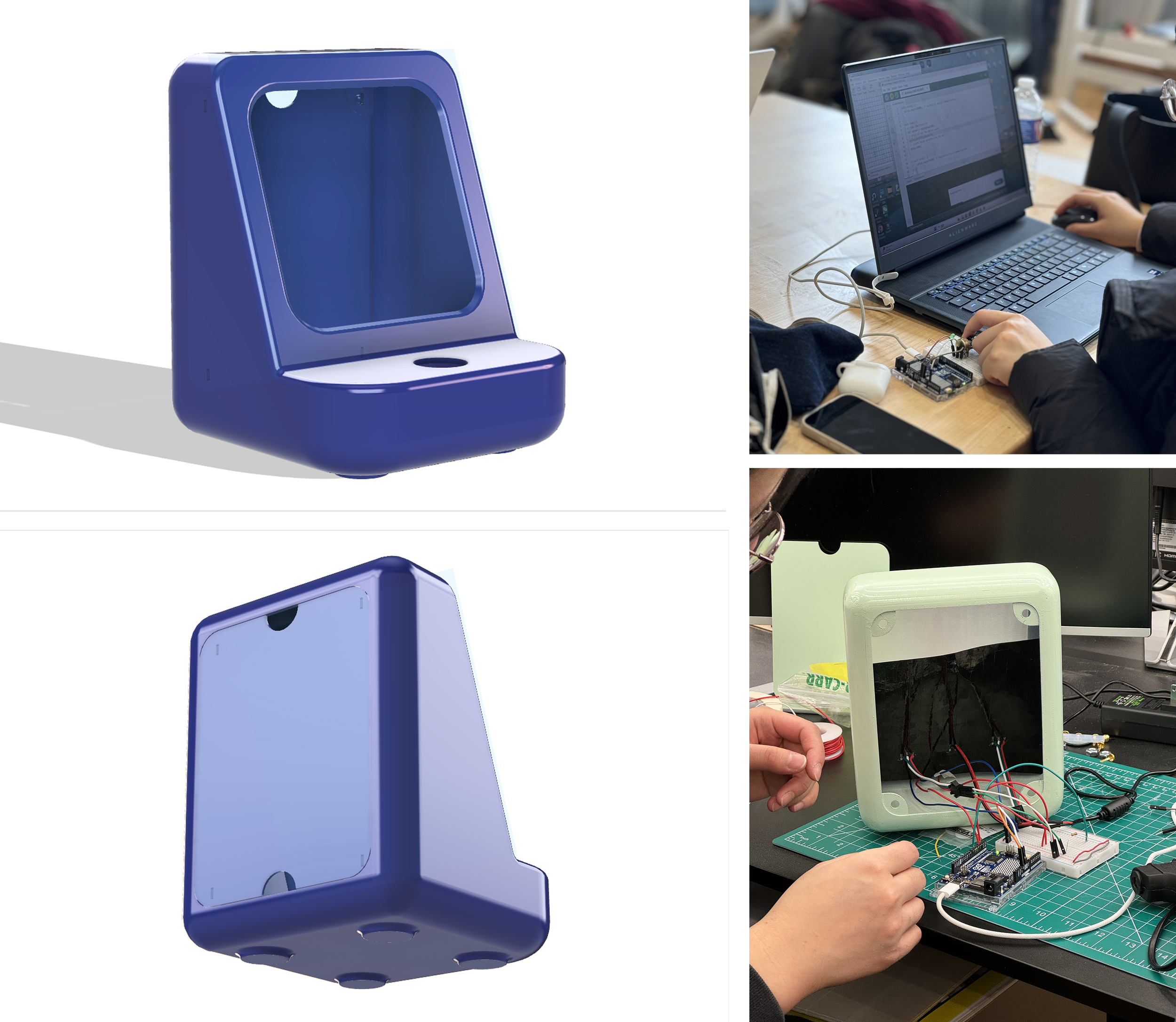 Digital models and physical prototypes translate the concept into a functional object. Rapid iteration tested form factors, interaction placement, and internal constraints, allowing the system logic and physical design to co-evolve.