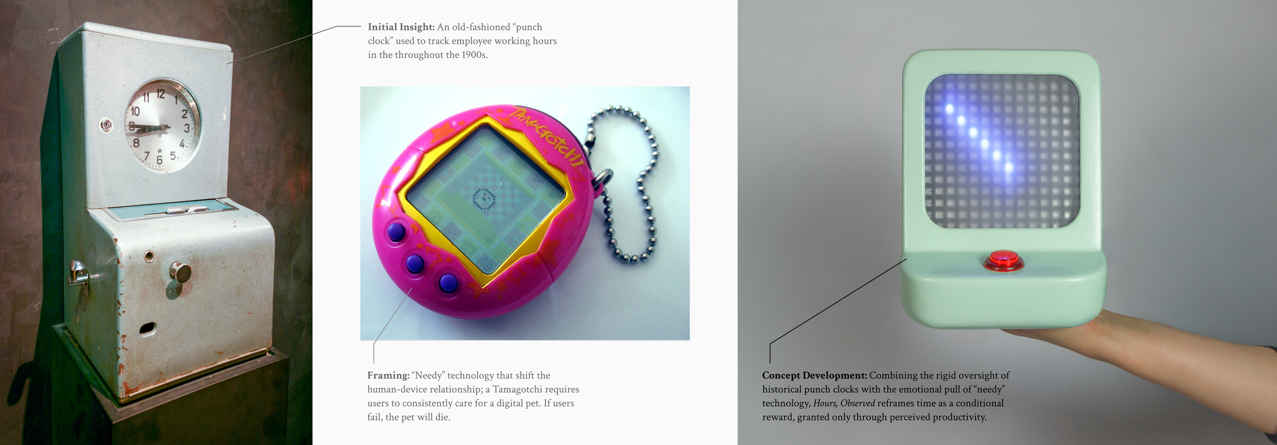 As a critique of the over-reliance on optimization culture and machine-driven judgment, this dystopian punch-clock inverts the human-device relationship, judging productivity in real-time, and exposes how contemporary technologies quietly condition behavior through judgment and reward.