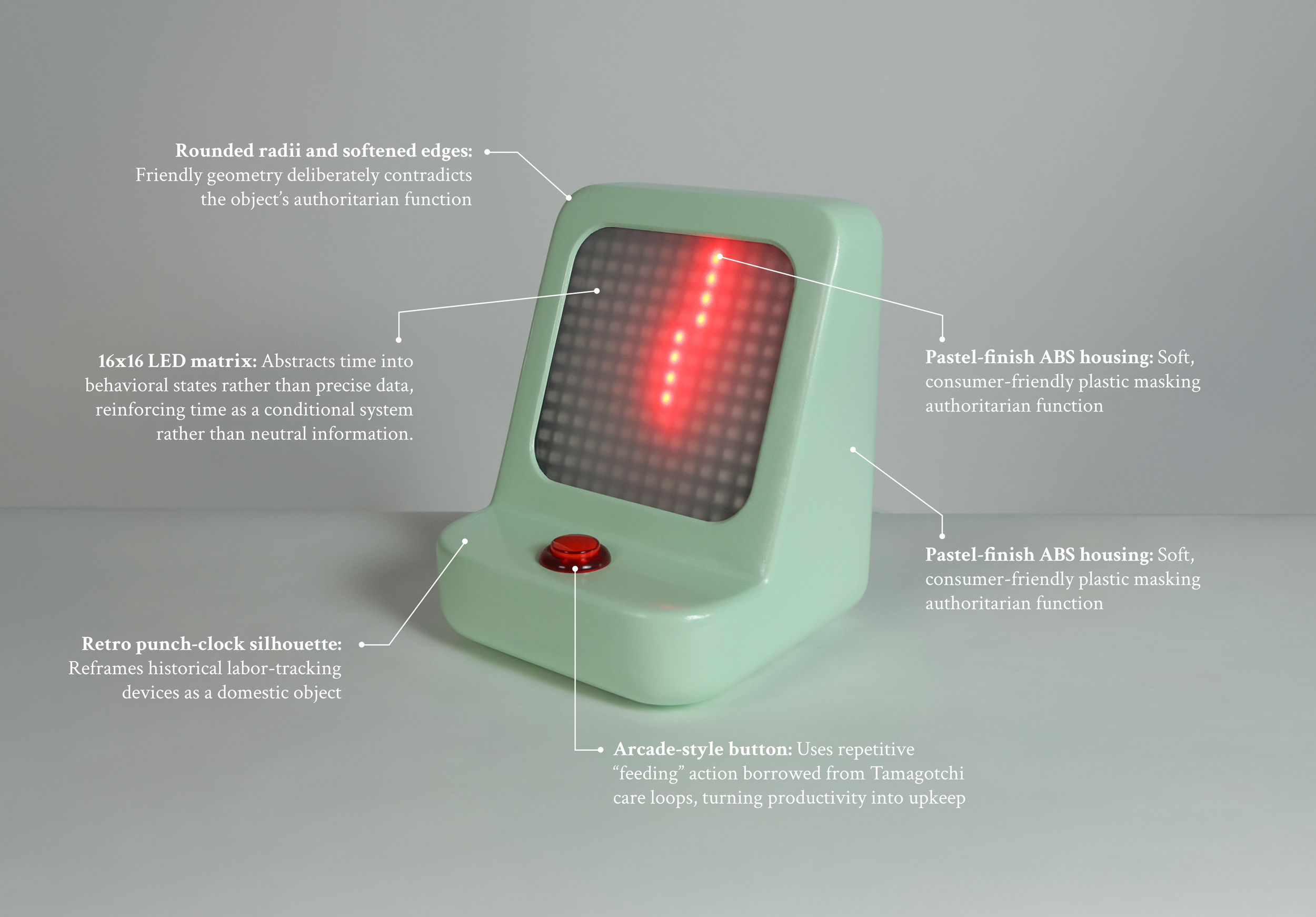 The final object presents a deceptively friendly, desk-scale punch clock that conditions access to time through perceived productivity. Soft materials and color contrast with the device’s punitive behavior, reinforcing the critique of optimization culture through form, interaction, and system logic.