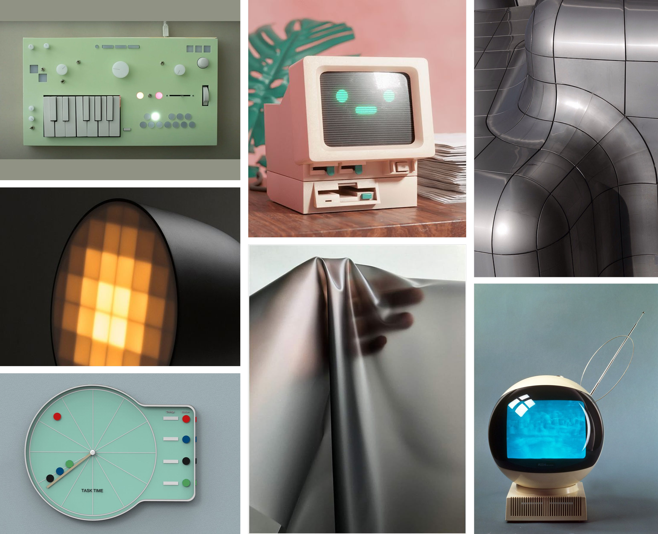 Explores the tension between soft, approachable forms and darker, authoritarian undertones. Pastel plastics, rounded industrial objects, and retro interfaces establish an inviting aesthetic that masks systems of control and surveillance beneath the surface.