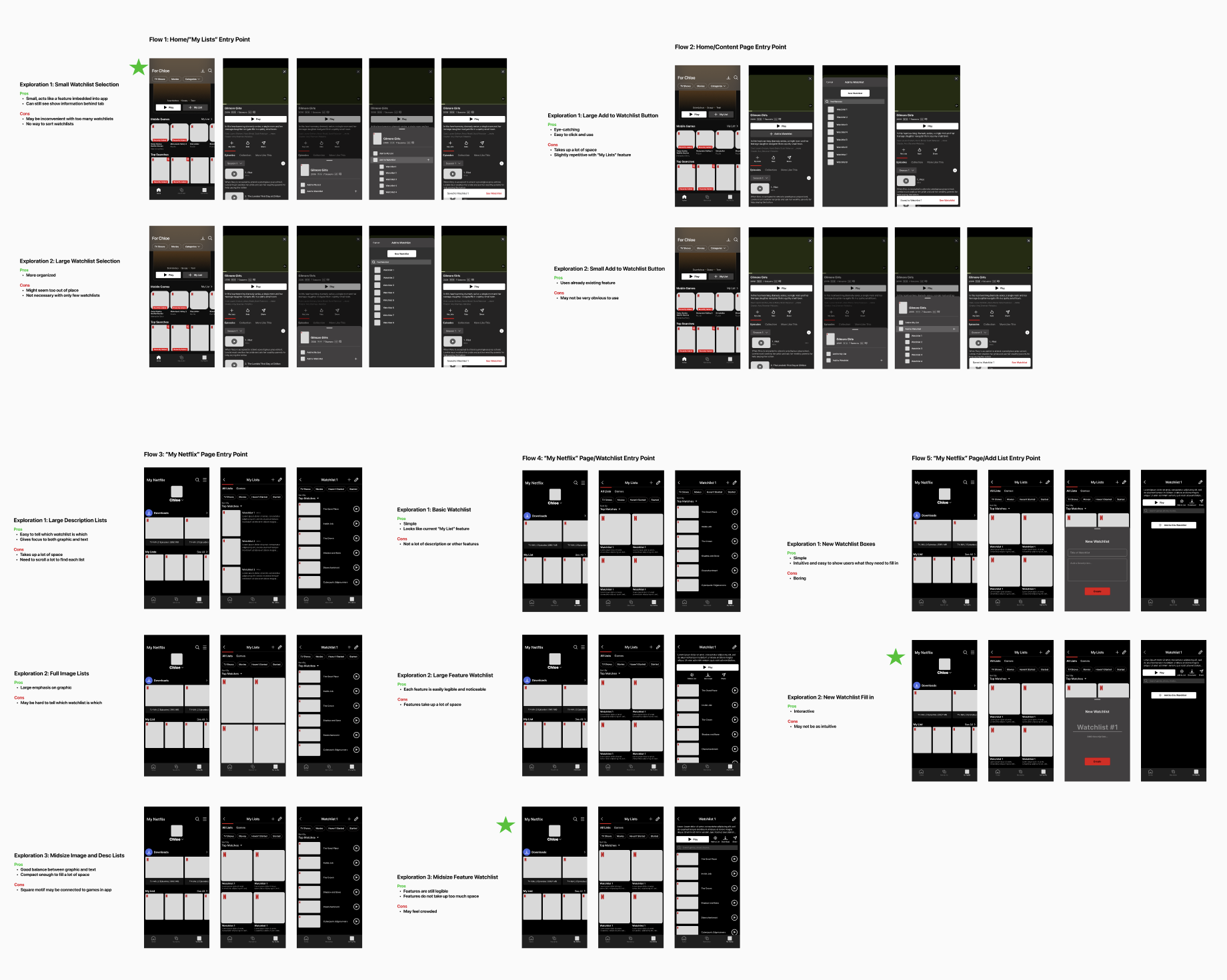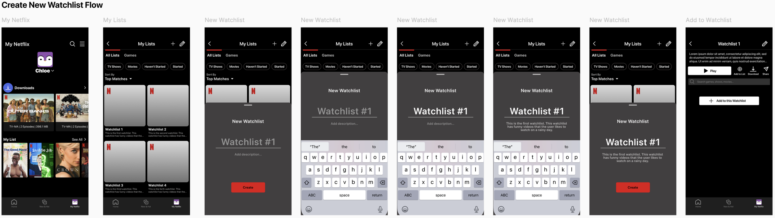 The mid-fidelity prototype focused on developing customized watchlists, translating sketches into wireframes that clarified layout and navigation. Key entry points were explored—through the home screen, the existing “My List,” and friend recommendations—to ensure personalization felt seamless within the Netflix app.