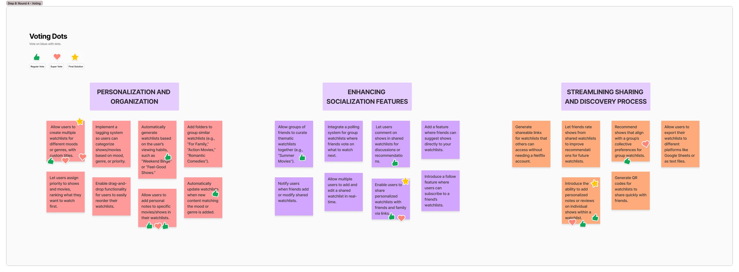 Brainstorming involved an 8-step process involving users who collaborated to ideate 3 potential solution spaces: Personalization and Organization, Enhancing Socialization Features, and Streamlining Sharing and Discovery Process. The 3 definitive features chosen from this session were Custom Watchlists, Shared Watchlists, and Shared Comments.