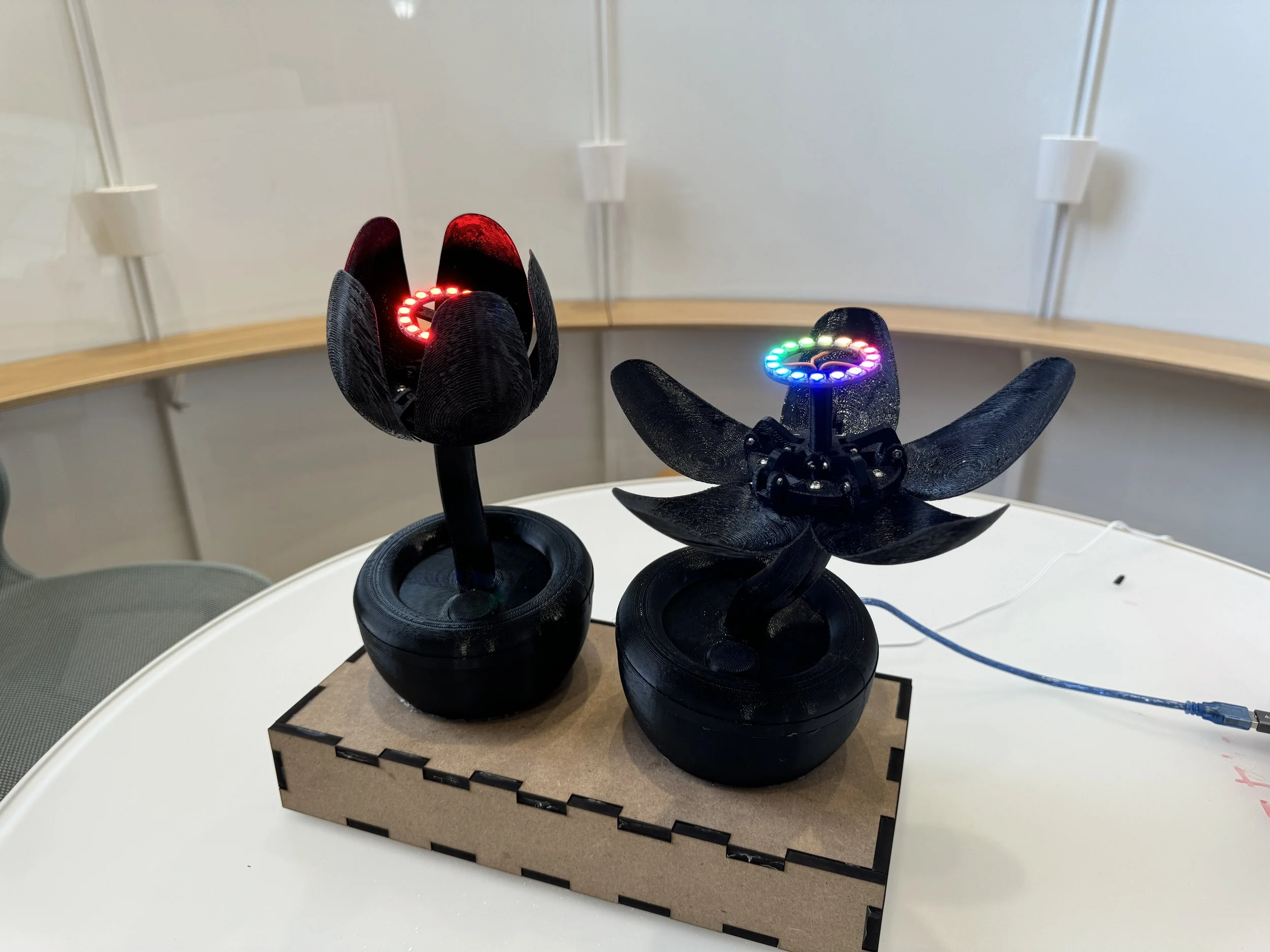 PetalPoints integrates multiple electronic components into a cohesive system that transforms chore tracking into an engaging interactive experience. A NeoPixel LED ring provides dynamic color feedback, while a servo motor drives physical movement within the flower form to signal progress and performance. A rotary encoder enables user input and control, and a piezo buzzer adds sound-based responses to reinforce interaction and competition.
