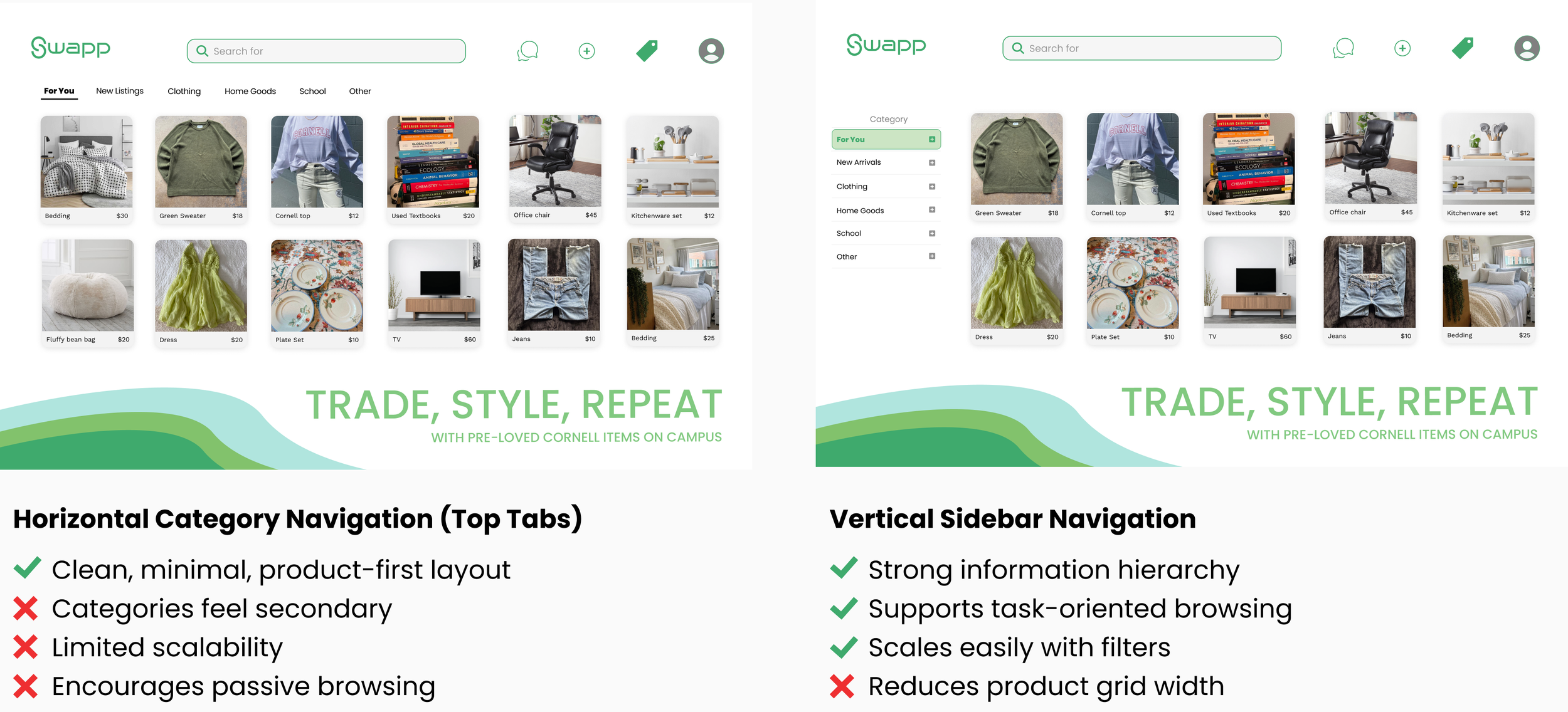 I ultimately selected the vertical sidebar navigation because it better aligned with how students actually approach resale on campus. User behavior is largely task-oriented, and students typically visit SWAPP with a specific item in mind rather than browsing casually. The sidebar establishes a stronger information hierarchy, making categories immediately visible and reinforcing structured navigation from the moment users land on the page.