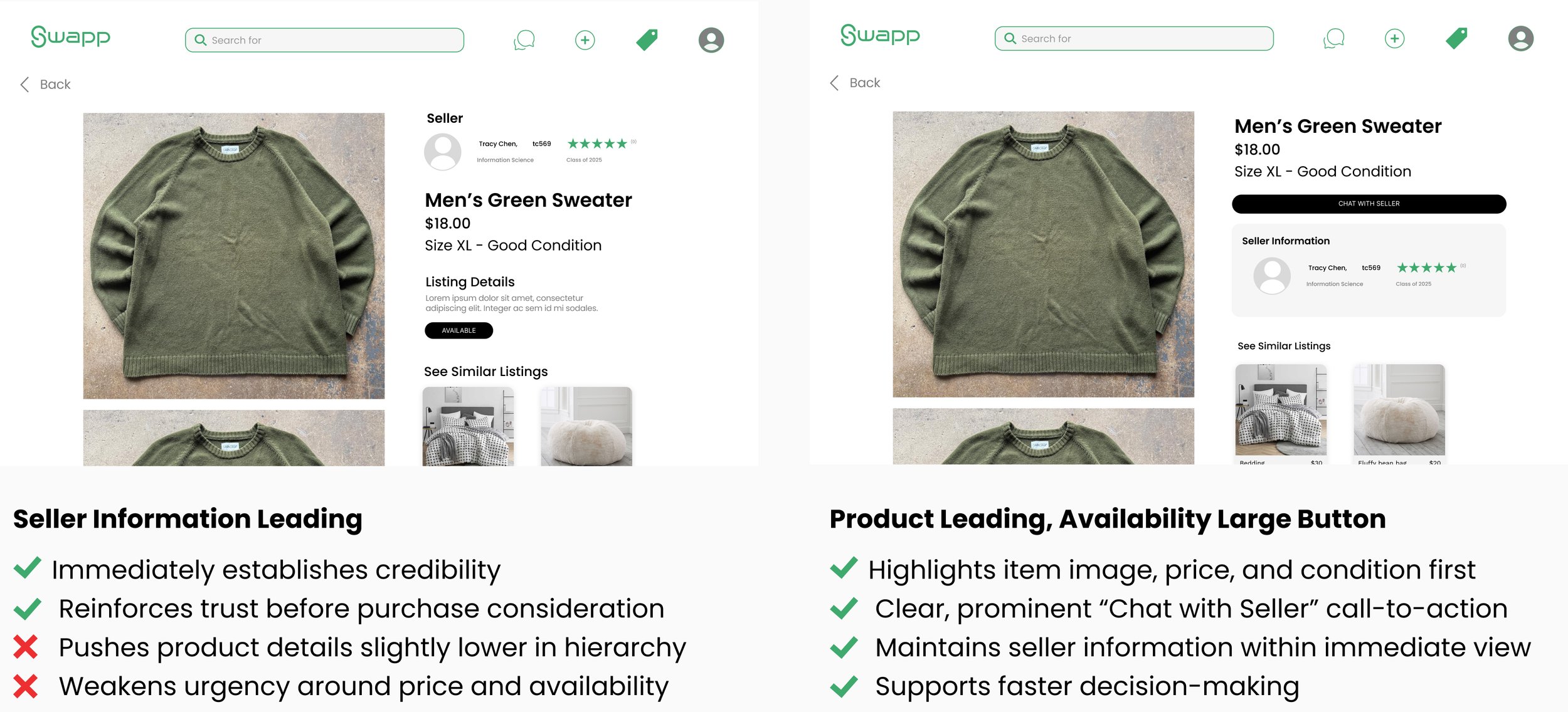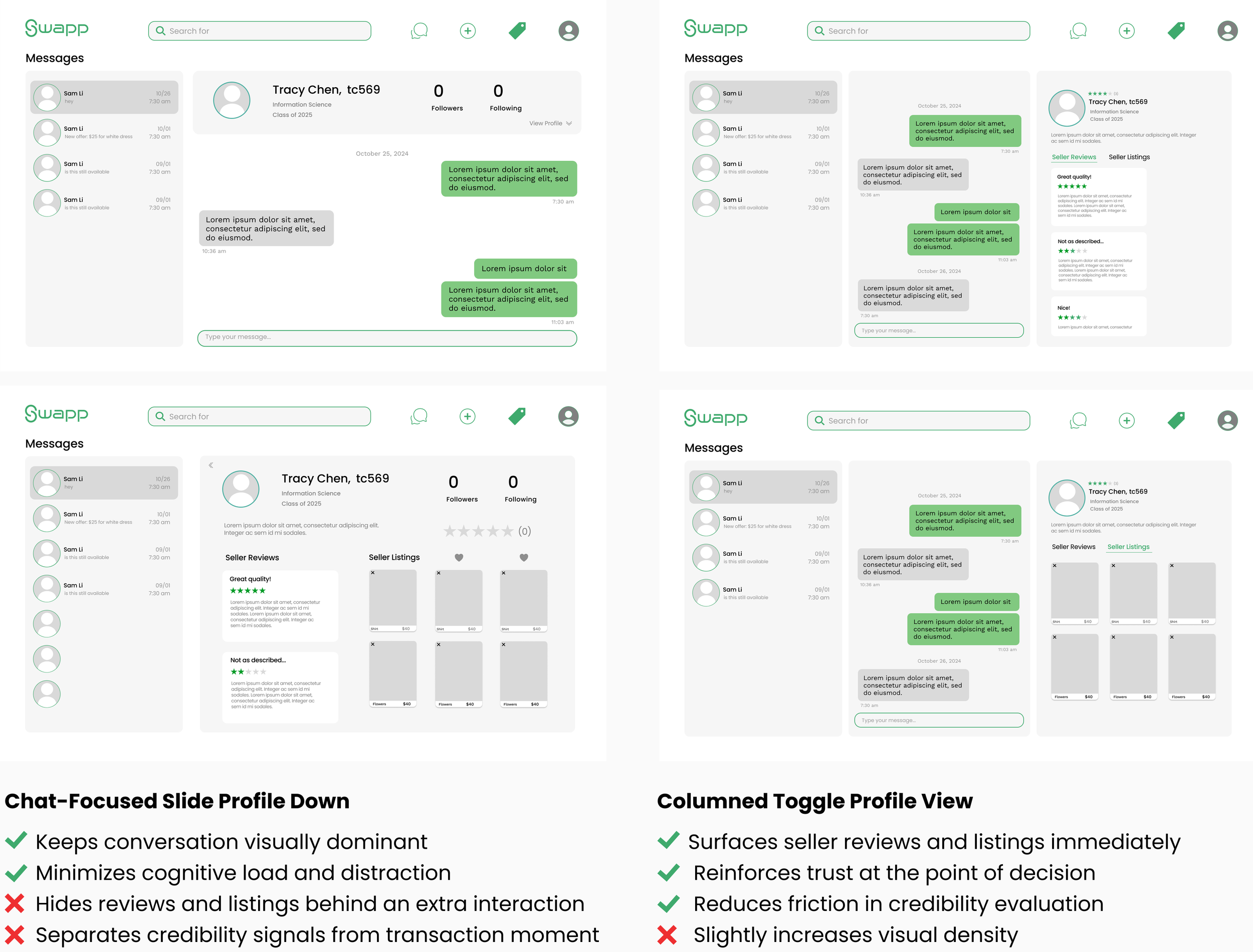 I ultimately chose the columned toggle profile view because trust and transparency are central to peer-to-peer resale. Unlike purely social messaging platforms, SWAPP conversations are transactional, and buyers need immediate access to seller reviews and active listings to make confident decisions. While the chat-focused layout felt cleaner, it concealed critical credibility signals behind an extra step. By surfacing trust indicators alongside the conversation, the columned view better supports informed decision-making and reinforces the platform’s legitimacy at the moment it matters most.